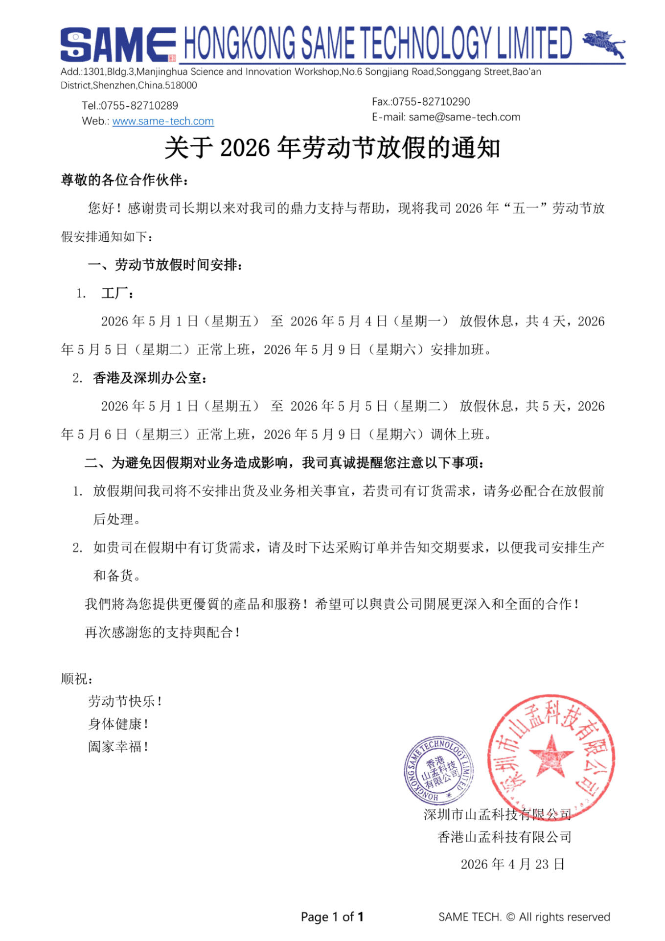1.放假期间我司将不安排出货及业务相关事宜,若贵司有订货需求,请务必配合在放假前