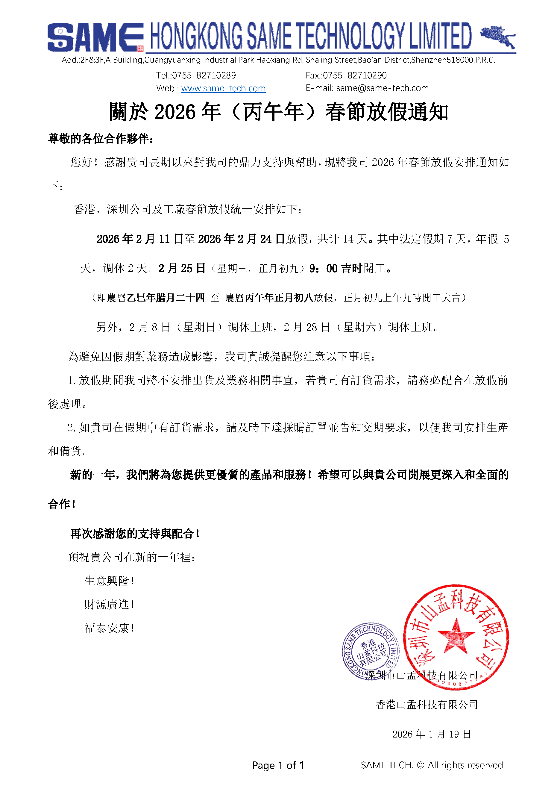 您好!感谢贵司长期以来对我司的鼎力支持与帮助,现将我司 2026 年春节放假安排通知如下:
