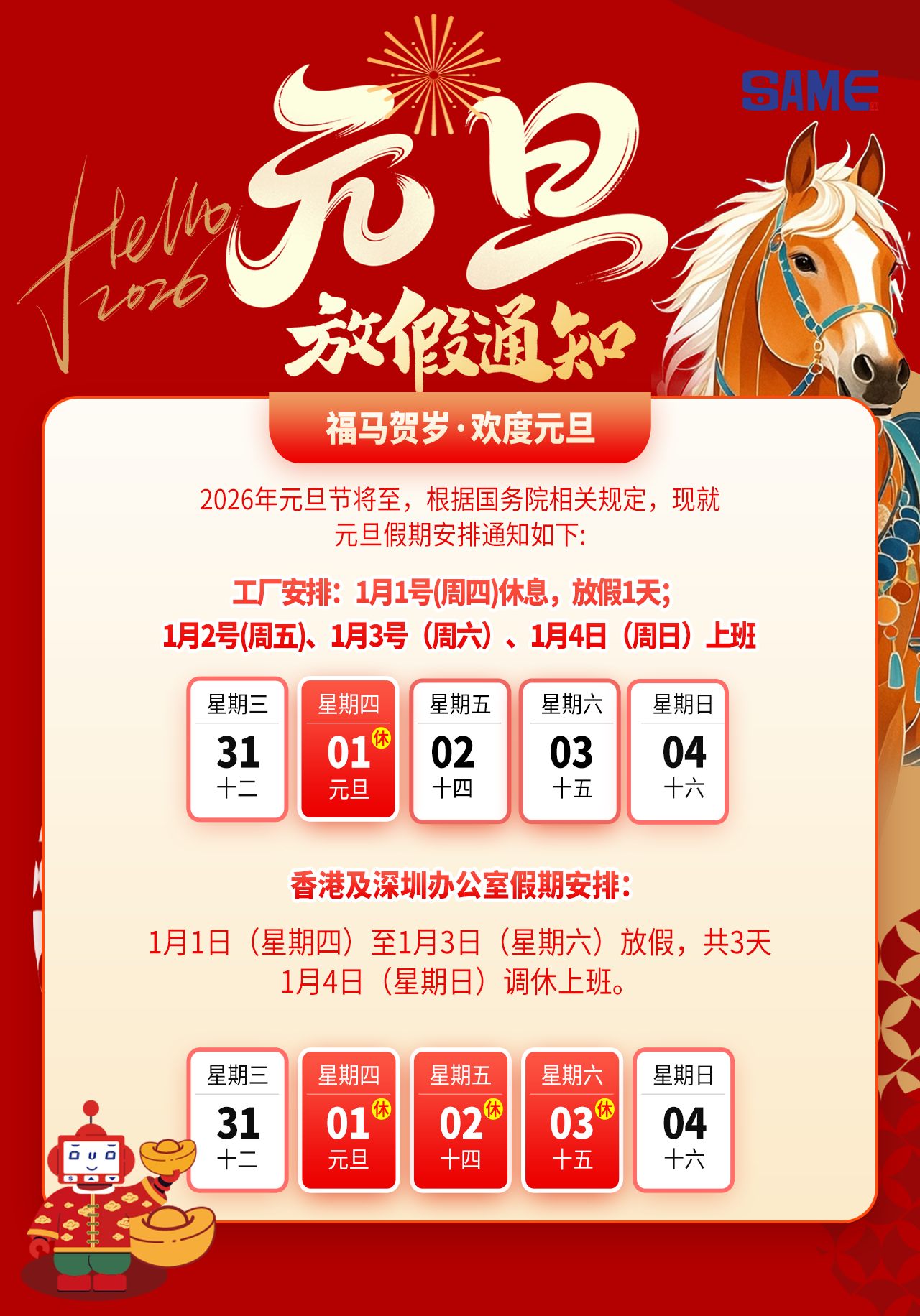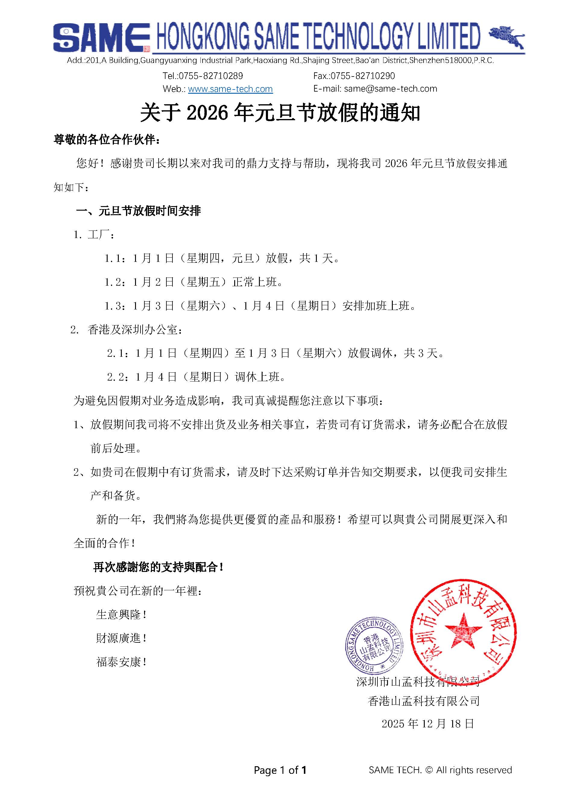 您好!感谢贵司长期以来对我司的鼎力支持与帮助,现将我司2026年元旦节放假安排通知如下: